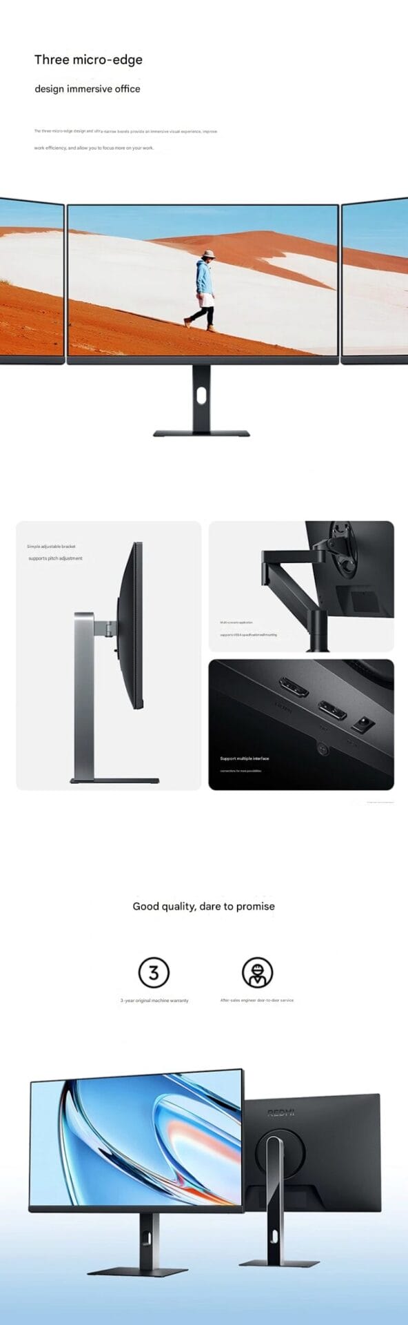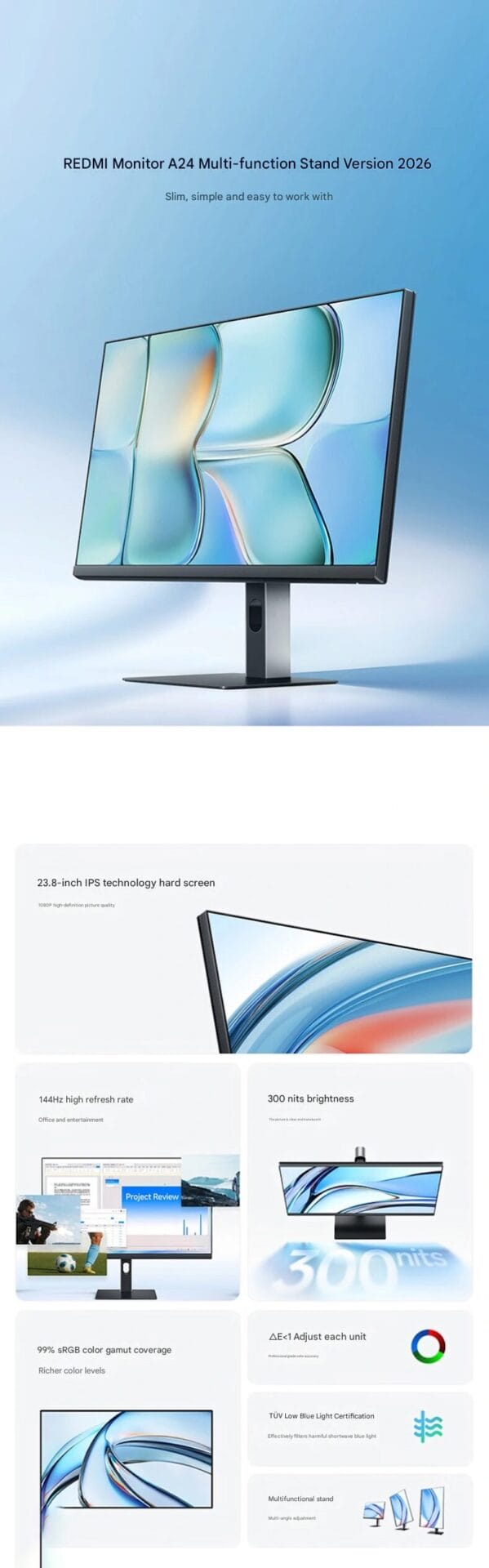 O Redmi Monitor A24 Multi-function Stand Edition (2026) adota um painel IPS 1920×1080 com um tempo de resposta de 6 ms, garantindo um desempenho suave para jogos e uso diário no escritório. A tela oferece 300 nits de brilho típico, profundidade de cor de 8 bits (6 bits + FRC) e cobertura de 99% da gama de cores sRGB, proporcionando uma reprodução precisa de cores para edição de fotos, design e entretenimento.