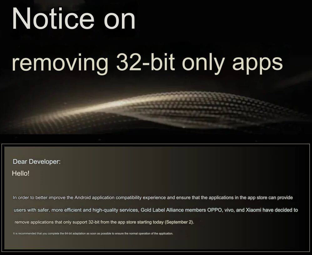 The Golden Label Alliance, commonly known as the Mobile Smart Terminal Ecological Alliance, has just enforced a critical policy affecting both Android developers and users alike. This move, targeted by alliance members OPPO, vivo, and Xiaomi, is at smoothing application compatibility and/or performance for the removal of support for all apps that are only 32-bit architecture from their respective application stores. This policy change takes immediate effect as of September 2, 2024.