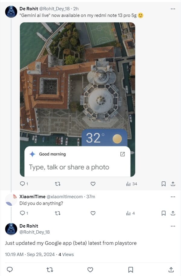 A Xiaomi anunciou que o Gemini Live chegaria aos seus dispositivos durante o lançamento da série 14T, depois que a Samsung e o Google anunciaram a data de ativação de 6 de outubro de 2024. No entanto, conforme relatado por um usuário no X, com a atualização do aplicativo do Google para sua versão Beta mais recente (15.38.49), o Gemini Live começou a funcionar antes do previsto.