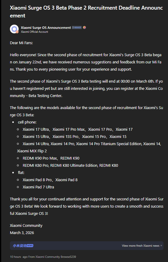 A Xiaomi anunciou oficialmente hoje o prazo final para a segunda fase do programa de testes beta do Xiaomi HyperOS 3. O teste beta estável interno começou há apenas dois dias, e a empresa planeja liberar essas versões exatas para os testadores públicos em breve. O registro para essa atualização se encerra exatamente à meia-noite do dia 6 de março na China. Essa fase crítica de testes prepara o sistema para a versão oficial do Xiaomi HyperOS 3.1, que será lançada oficialmente em março.