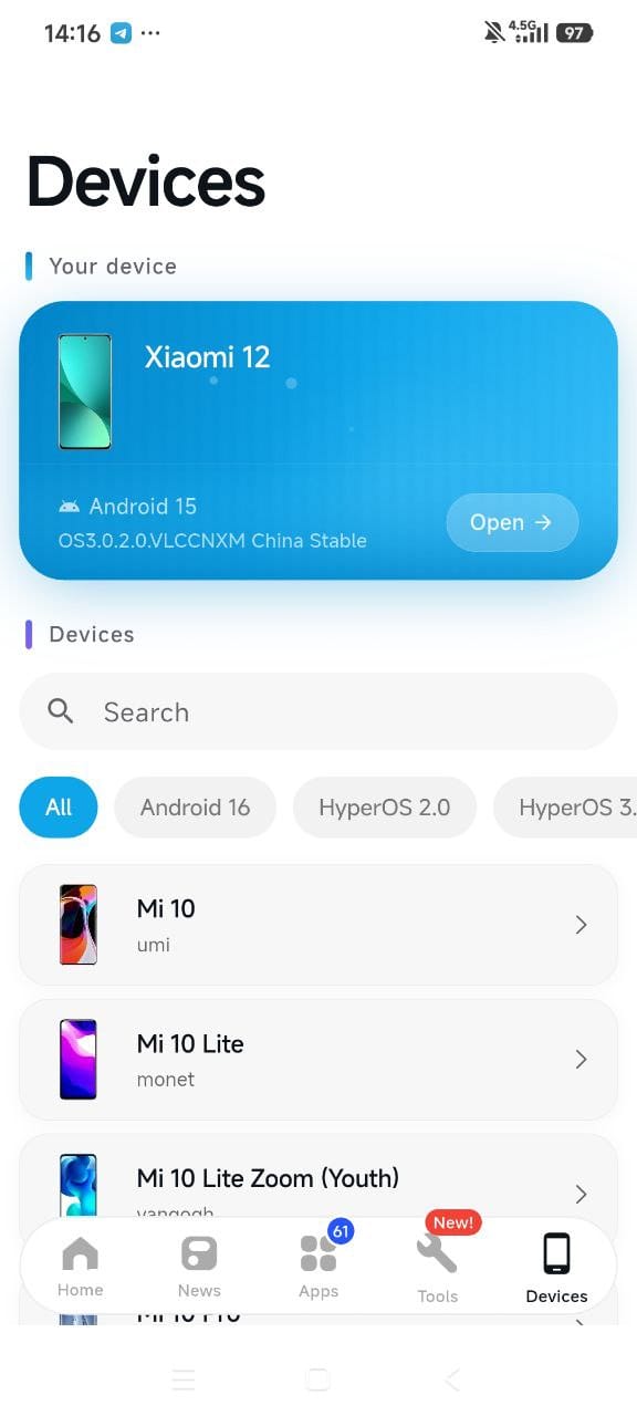 O MemeOS Enhancer reformulou completamente sua interface desatualizada e pouco atraente. Com a aba de ferramentas recém-adicionada, você poderá usar recursos ocultos de forma mais amigável. Além disso, as seções de dispositivos e notícias foram redesenhadas. Agora você pode ver facilmente os dispositivos compatíveis com HyperOS 3 e HyperOS 3.1 e ler notícias sobre todas as categorias.