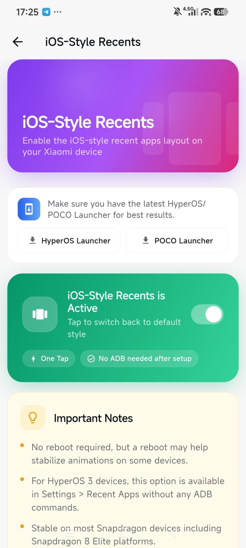 O menu de aplicativos recentes da pilha de cartões no estilo iOS foi adicionado ao HyperOS 3.1. Ele funciona na versão mais antiga do HyperOS, mas para alguns dispositivos selecionados. Depois de atualizar seu HyperOS e POCO Launcher para a versão oficial mais recente dentro do aplicativo, você pode ativar o recurso oculto de aplicativos recentes no estilo iOS em apenas algumas etapas com o MemeOS Enhancer.