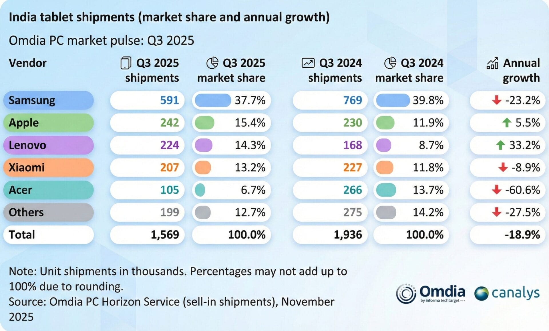 A análise mais recente da Omdia mostra um cenário misto no mercado de computação do terceiro trimestre de 2025 na Índia, onde o segmento de PCs alcançou um crescimento anual de dois dígitos, enquanto o mercado de tablets sofreu uma contração notável. De acordo com o relatório da Omdia, as remessas de PCs da Índia atingiram 4,9 milhões de unidades durante o trimestre, representando um aumento de 13% em relação ao ano anterior. A demanda de notebooks e desktops permaneceu forte graças ao acúmulo de estoques na temporada de férias e a um ciclo decente de compras comerciais. Enquanto isso, as remessas de tablets caíram 19%, com a Xiaomi registrando um declínio de 8,9% em relação ao ano anterior, apesar de continuar a desfrutar de uma tração saudável no segmento de consumo. Outros dados de remessa da Xiaomi podem ser vistos em nossas seções sobre dados de mercado da Xiaomi e desempenho da série Xiaomi Pad.