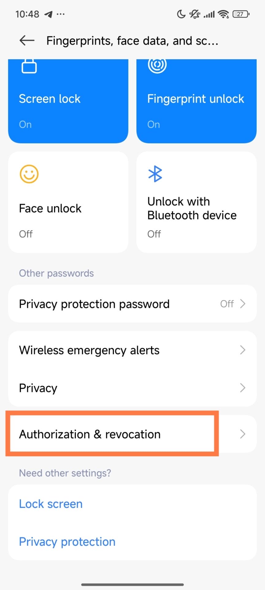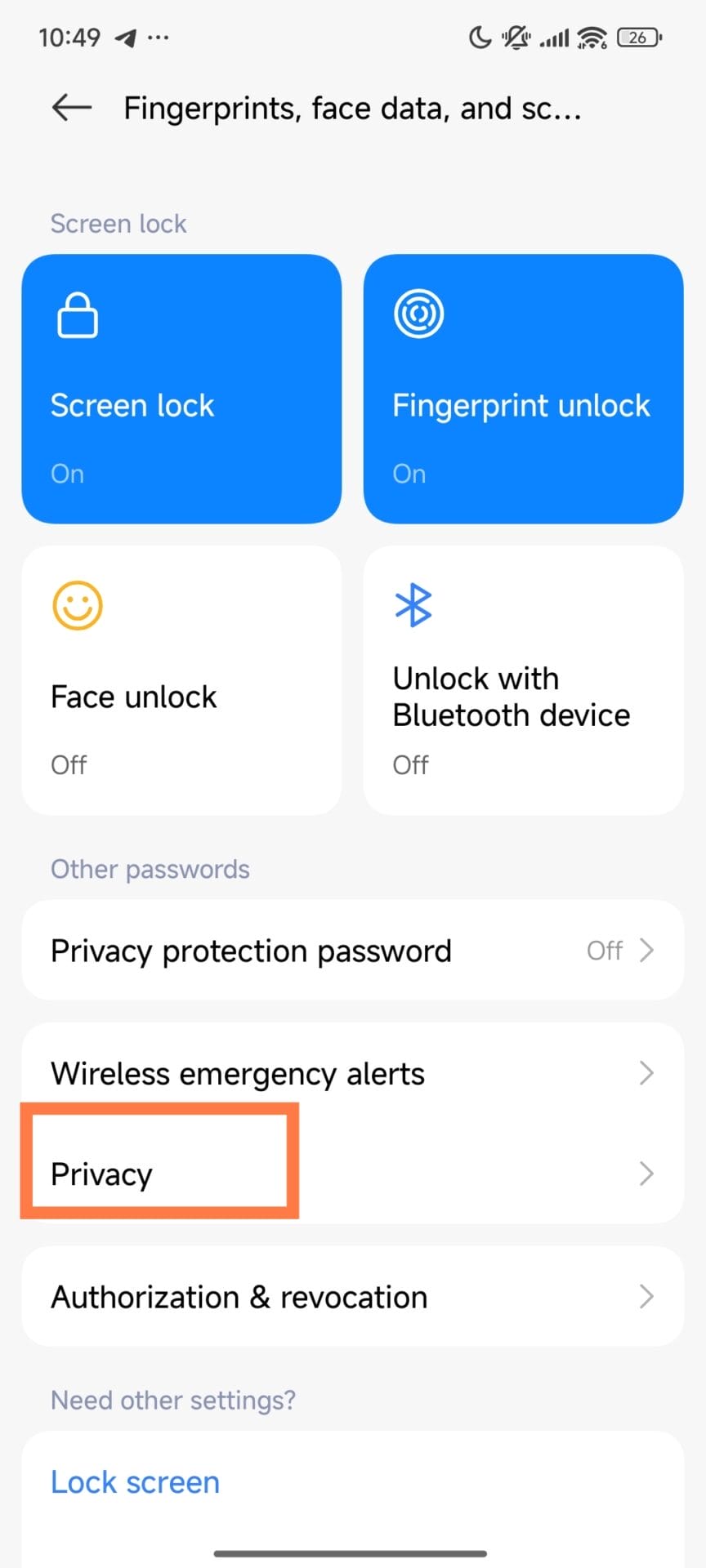 - Vá para Impressões digitais, dados faciais e bloqueio de tela
