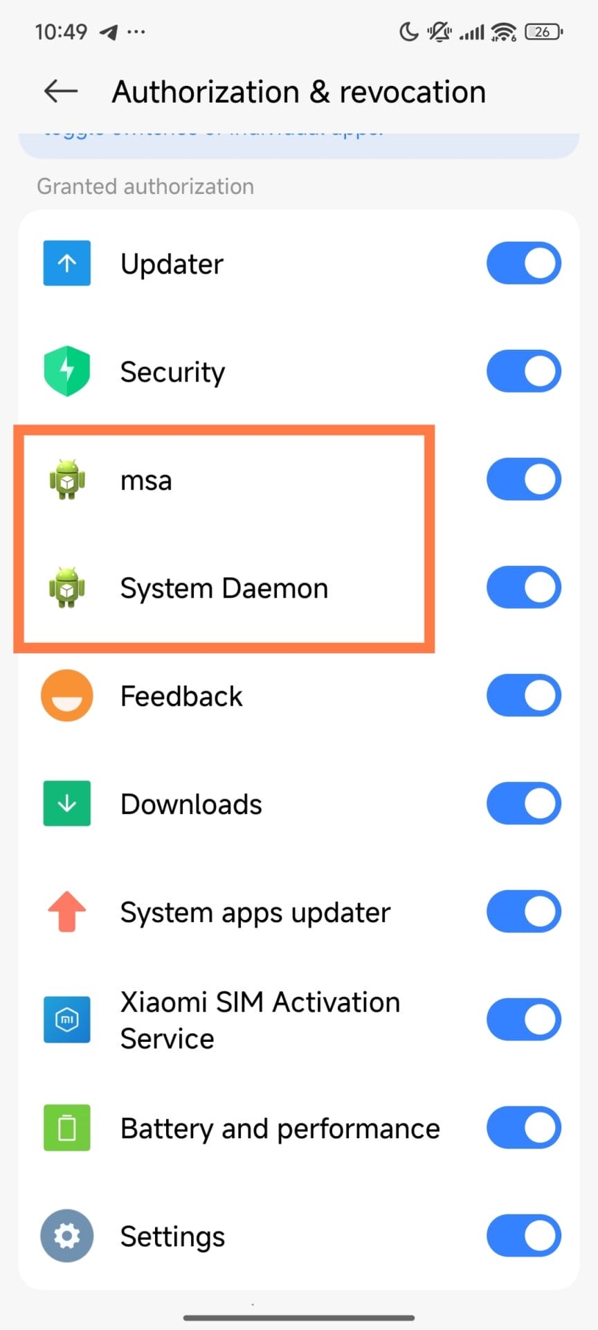 - Encontre o MSA e o MiuiDaemon ou o System Deamon
