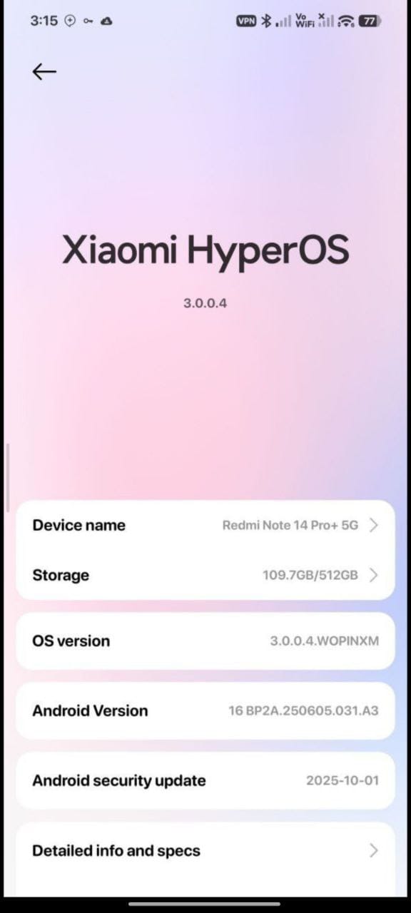O lançamento do HyperOS 3 Beta no Redmi Note 14 Pro+ 5G é resultado do compromisso da Xiaomi em fornecer aos seus usuários recursos de software da versão mais recente do sistema operacional Android, que é o Android 16. O dispositivo é um dos primeiros modelos da série Note a suportar o sistema operacional mais recente da Xiaomi.