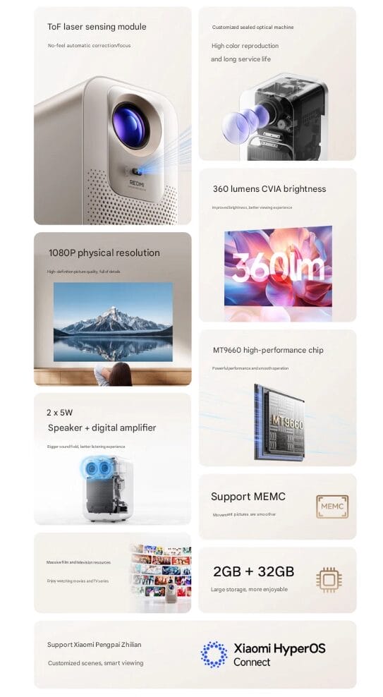 O Redmi Projector 4 da Xiaomi continua o legado da marca de combinar desempenho, design inteligente e preço acessível. Com interpolação de movimento MEMC, adaptação de imagem AI e integração perfeita com o ecossistema Xiaomi, ele oferece uma experiência de visualização premium em um formato compacto. Esse projetor reforça o compromisso da Xiaomi de levar a tecnologia de entretenimento doméstico de ponta para mais usuários a preços acessíveis.