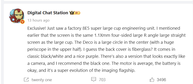 Conforme relatado pela IT Home, há uma nova placa de engenharia Snapdragon 8 Elite Gen 5 à solta, recentemente descoberta pelo popular informante @Digital Chat Station. Esse carro-chefe elusivo vem com uma tela plana de ângulo R grande de quatro lados de 1,1x mm, o mesmo tipo de construção de seu irmão “Pro”. O módulo Deco traseiro do dispositivo tem a forma de um grande círculo, que contém o que parece ser uma enorme câmera teleobjetiva periscópica –o que indica que esse é o suposto Xiaomi 17 Ultra.