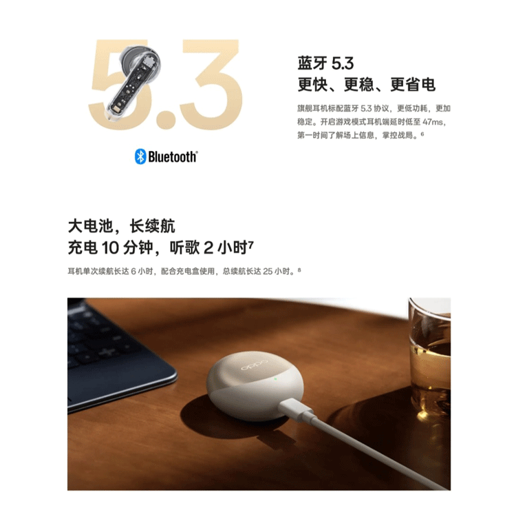 OPPO Enco R2 comes in a gold color variant, with the model number ETE81 for the earphones and ETE82 for the charging case. OPPO claims that the new Hi-Fi Digital Signal Processor (DSP) in the earbuds offers a processing power increase of approximately 2500%. This improvement ensures a clearer audio experience compared to previous OPPO earphones. The earphones feature Hi-Fi 5 and employ 13.4mm drivers.