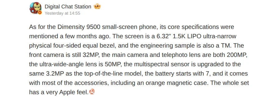 The latest information comes from well-known Chinese tipster Digital Chat Station, who shared several key specifications of the upcoming device.