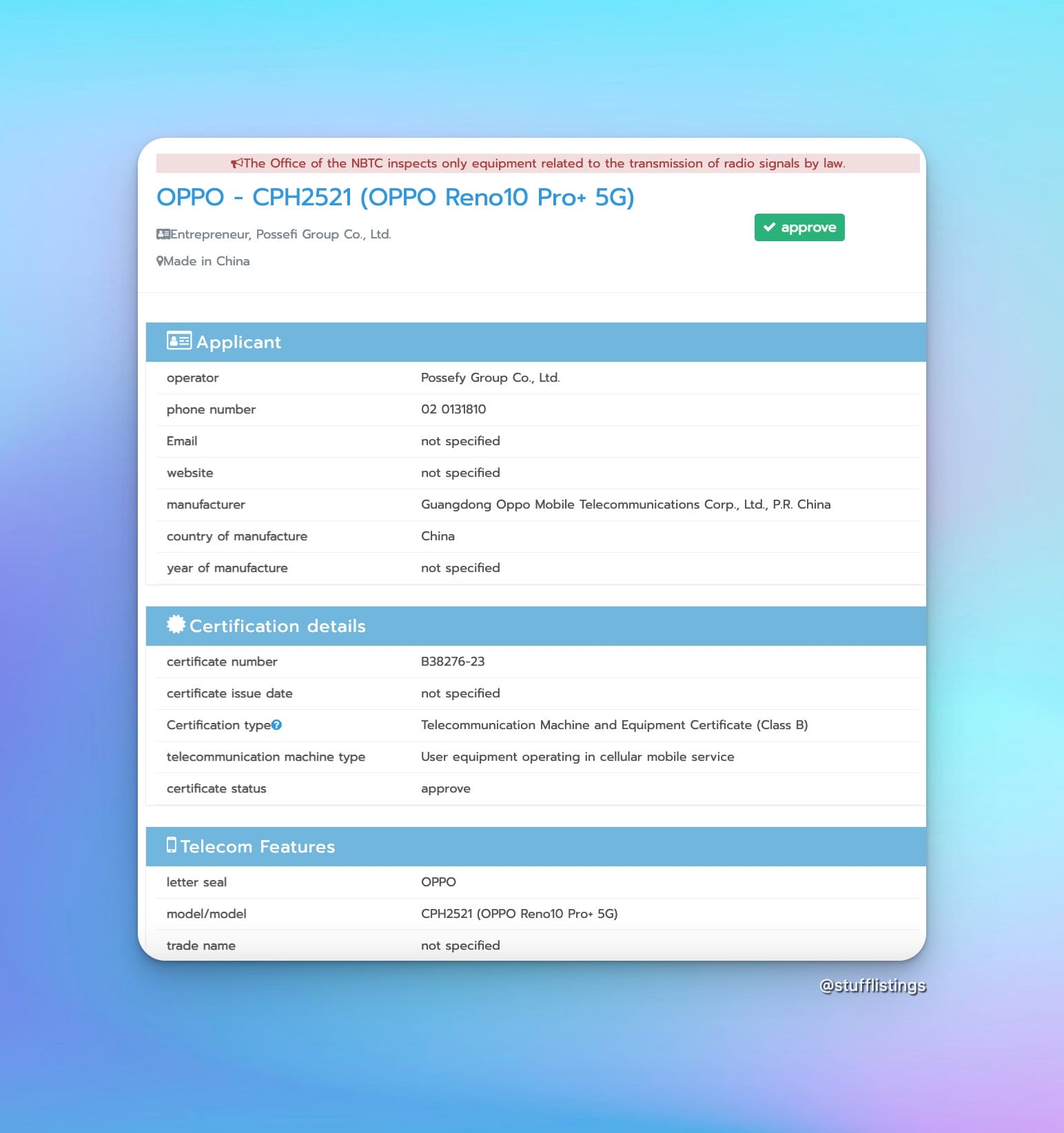 OPPO, a prominent smartphone manufacturer, continues to make strides in expanding its global presence and offering cutting-edge devices to consumers. The latest development comes in the form of the OPPO Reno10 Pro+ 5G receiving the NBTC (National Broadcasting and Telecommunications Commission) certification. This certification is a significant milestone for OPPO, as it ensures that the Reno10 Pro+ 5G meets the required standards for telecommunications and broadcasting in Thailand.