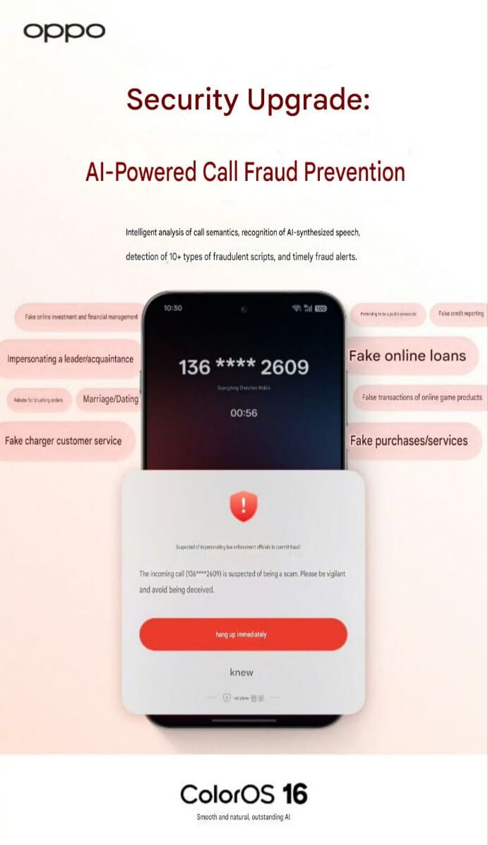 According to OPPO, the upgraded AI Call Fraud Prevention feature can intelligently analyze call content and detect various fraudulent semantics during a conversation. When suspicious activity is identified, the system automatically displays a pop-up alert to warn users of potential risks.