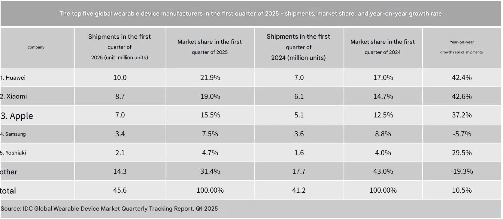 A categoria de dispositivos de pulso, que inclui smartwatches e pulseiras de fitness, demonstrou um crescimento consistente em todos os segmentos. As remessas globais de smartwatches atingiram 34,81 milhões de unidades no primeiro trimestre de 2025, refletindo um aumento de 4,8% em relação ao ano anterior. O mercado chinês de smartwatches contribuiu com 11,4 milhões de unidades, um aumento de 25,3%. As pulseiras de fitness superaram os smartwatches em termos de crescimento, com as remessas globais totalizando 10,76 milhões de unidades (um aumento de 34,0%) e as remessas chinesas atingindo 6,21 milhões de unidades, um aumento de 67,9% em relação ao ano anterior.
