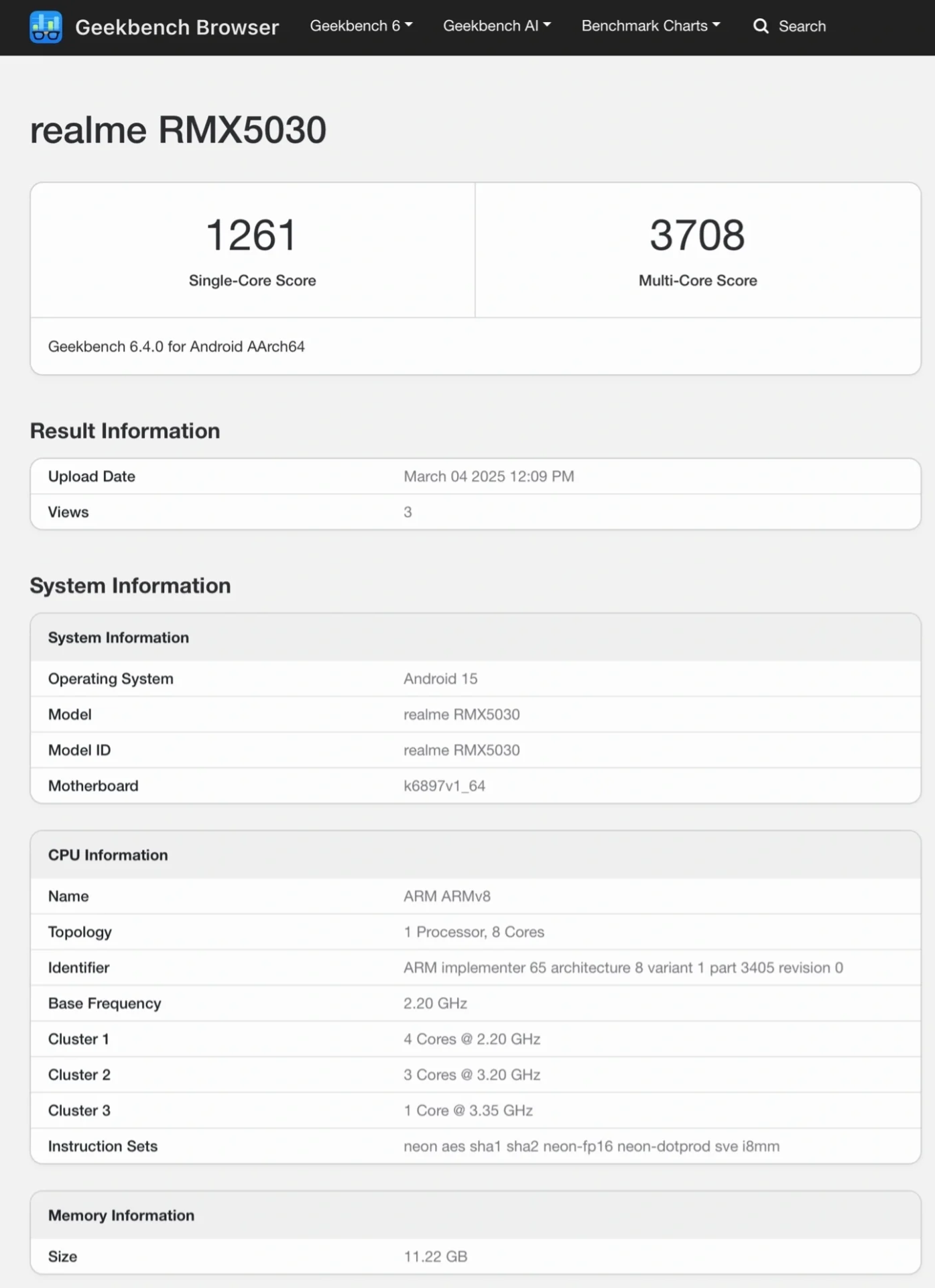 Das Realme P3 Ultra mit der Modellnummer RMX 5030 ist in der Geekbench-Datenbank mit atemberaubenden Spezifikationen aufgetaucht, die einige Augenbrauen aufwerfen dürften. Mit dem MediaTek Dimensity 8350 Chipsatz unter der Haube hat dieses Handy die Fähigkeit, eine robuste Leistung zu liefern, die es mit den großen Marken aufnehmen kann.