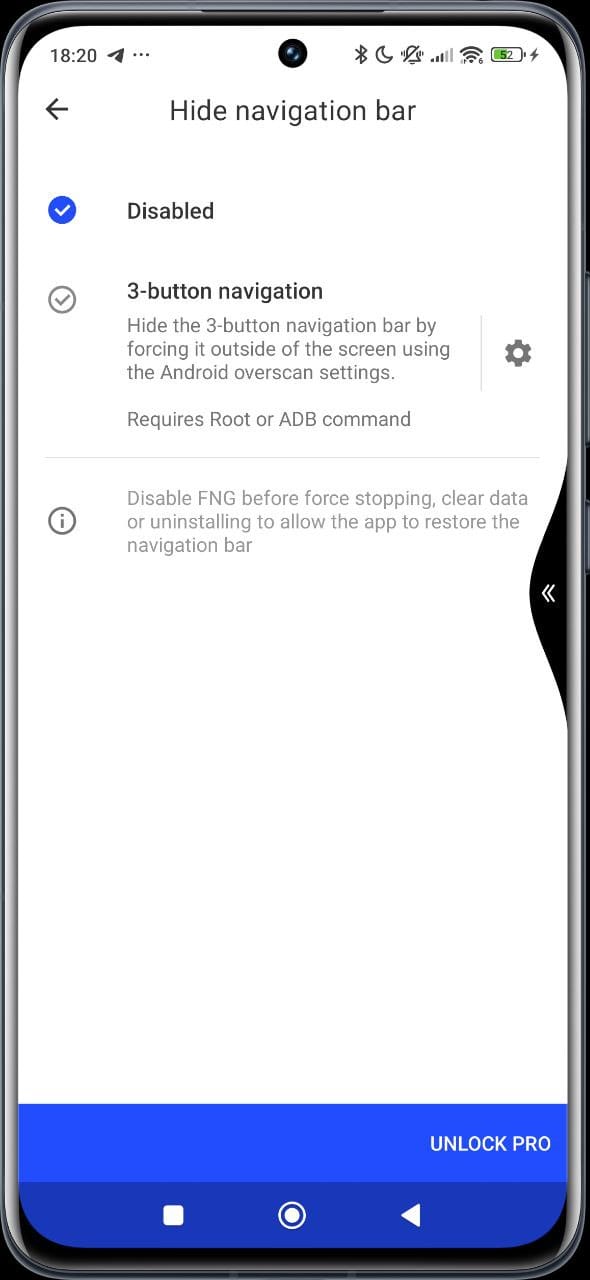 Como o Android 11 removeu o comando ADB wm overscan, você não pode mais ocultar a barra de navegação. O uso do FNG em um dispositivo Xiaomi moderno resulta em gestos que se sobrepõem à barra de três botões, o que é problemático e inutilizável.
