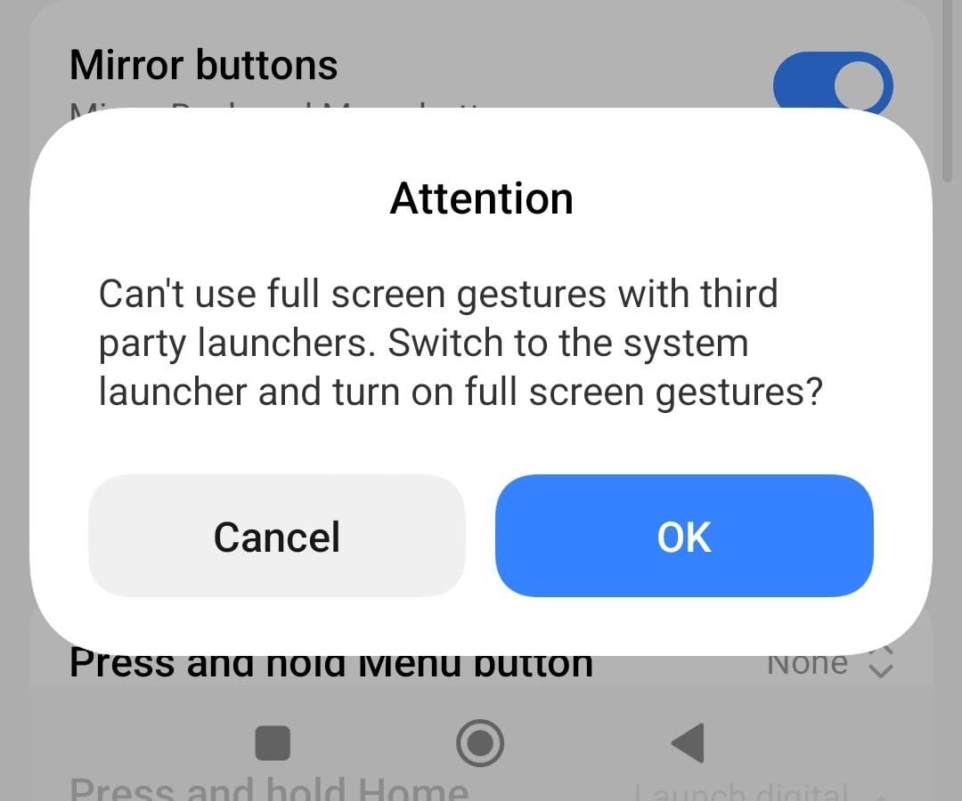 A navegação por gestos da Xiaomi é codificada no HyperOS System Launcher. Quando você muda para um personalizado, o sistema não consegue vincular a tela “Recentes” e as animações de deslizamento, forçando um retorno ao layout clássico de três botões. Essa é uma restrição deliberada do Google e da Xiaomi para manter a estabilidade da interface do usuário do sistema.