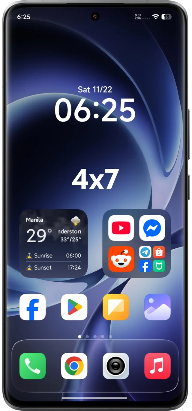 Esse design reduz intencionalmente a fragmentação do layout, garantindo que widgets, pastas grandes e recursos como o Super Island não entrem em conflito visual com as animações do sistema ou com os limites da zona de segurança em diferentes tipos de tela.