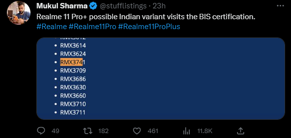 realme 11 Pro + has received BIS (Bureau of Indian Standards) certification so we can easily say that it will be introduced in India as well. Although the price is uncertain for the moment, we expect the realme 11 Pro+ 5G to be introduced next month. Mukul Sharma, a tech blogger on Twitter has indicated that realme 11 Pro+ 5G is coming up soon.
