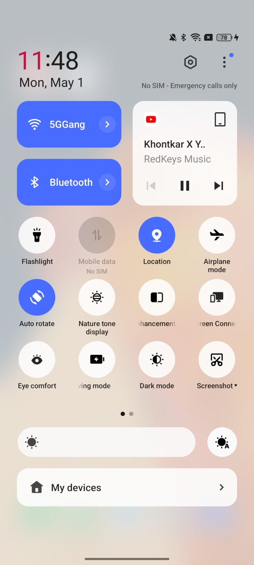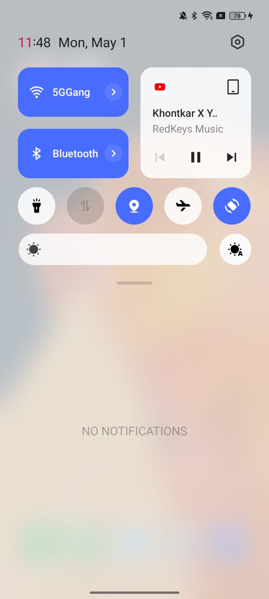 Here is the notification panel of OxygenOS 13.1 for a minor comparison. The circular icons for Wi-Fi and Bluetooth are present on the new notification panel instead of bigger and rectangular ones on old panel, they are replaced by brightness and sound sliders and moved to the right right side of the panel. The media player has been moved from the right side to the left. A noticeable feature is an editing icon appearing to the left side of the settings icon, which could actually allow editing the brightness and sound sliders. On the previous version, this edit icon appears when the notification panel is expanded.