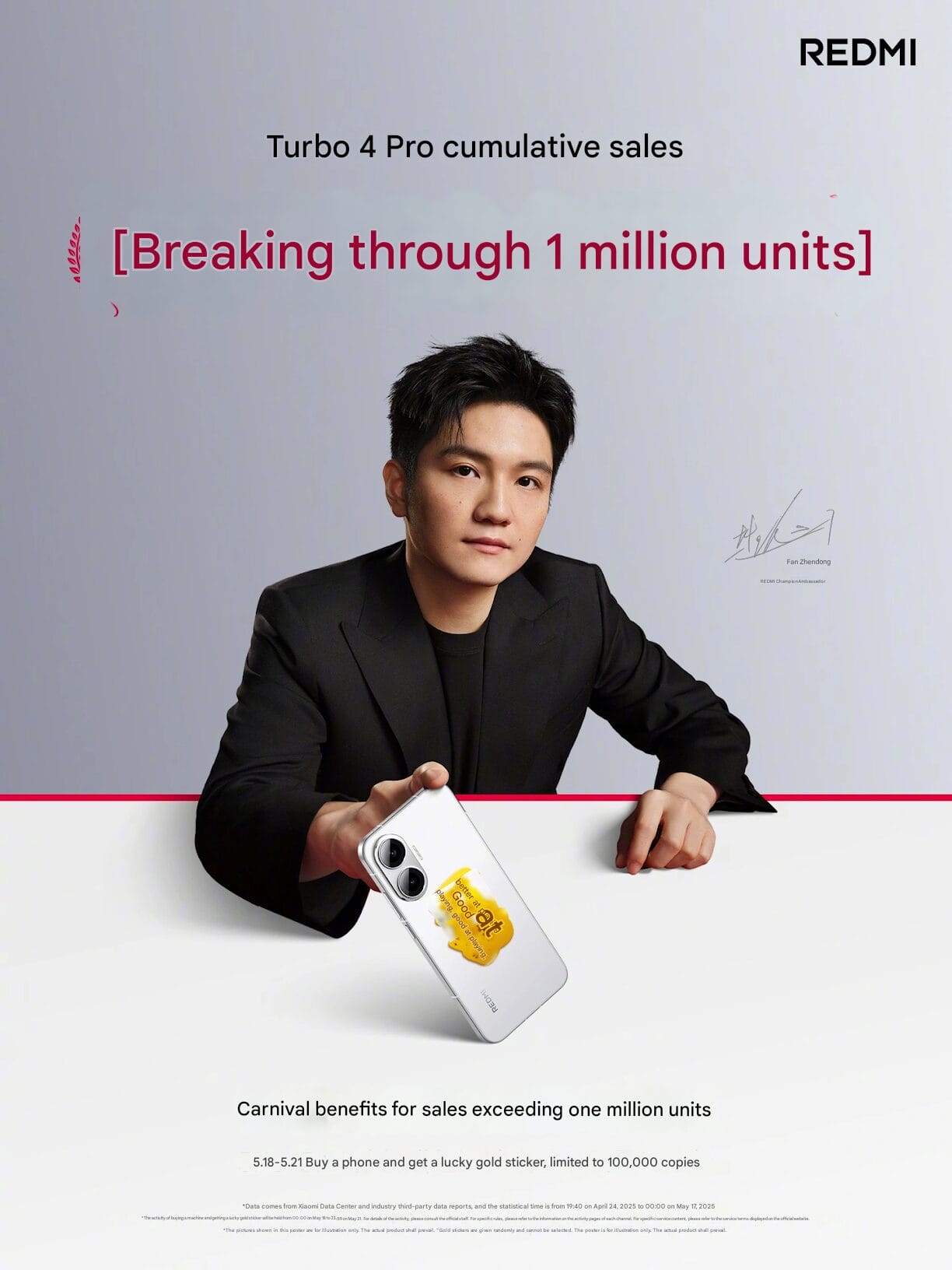 In celebration of reaching a major sales benchmark, Xiaomi is offering a promotion to customers. Between May 18 to May 21, whoever purchases REDMI Turbo 4 Pro gets a limited-gold lucky sticker as a gift. There will only be a total of 100,000 of these limited-edition stickers available, offering a rare opportunity to Xiaomi fans.