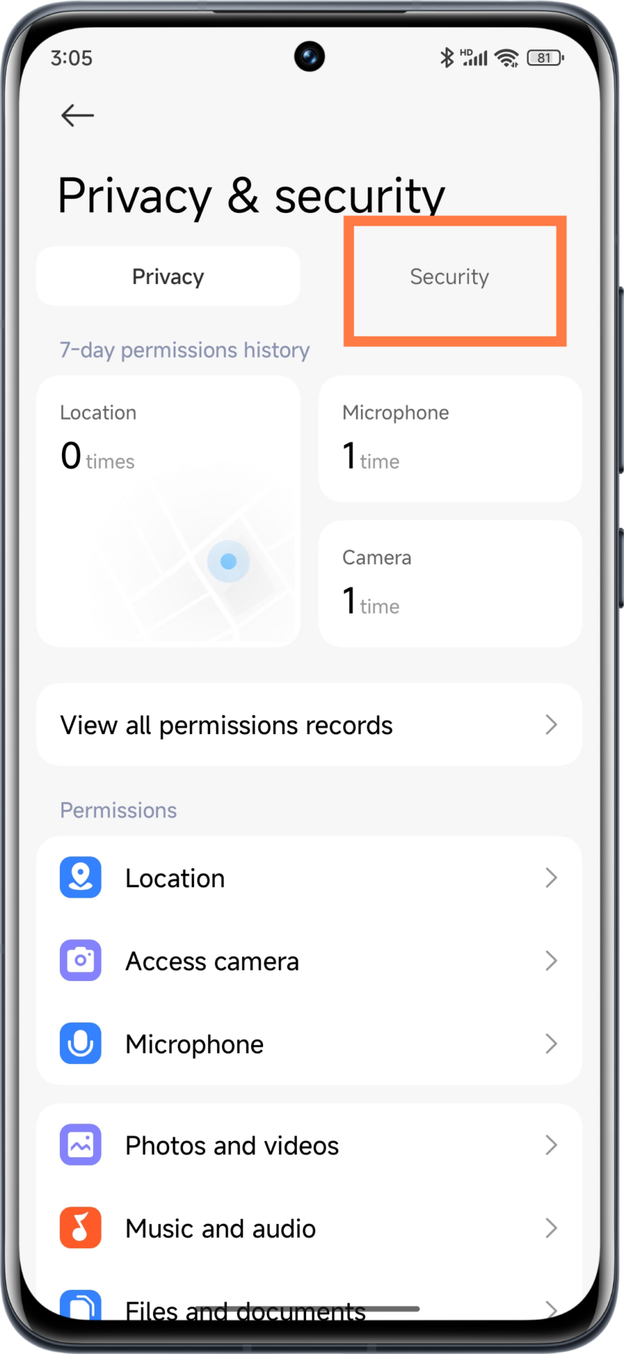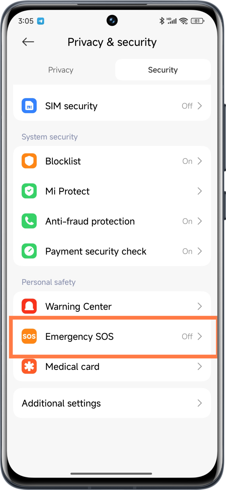 2. Role a tela para baixo e clique em “Segurança e emergências”