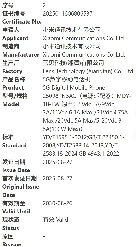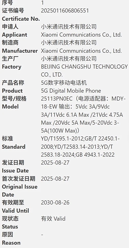 Dois dos três modelos certificados foram listados no China Quality Certification Center. O modelo 25098PN5AC é produzido pela Lens Technology (Xiangtan) Co., Ltd. e o 25113PN0EC é fabricado pela Xiaomi Communication Technology Co., Ltd. Ambos utilizam o cabeçote de carregamento MDY-18-EW, que suporta uma ampla gama de saídas de energia de até 100W. Isso garante o rápido reabastecimento da bateria, um ponto de venda importante no mercado atual de smartphones premium.