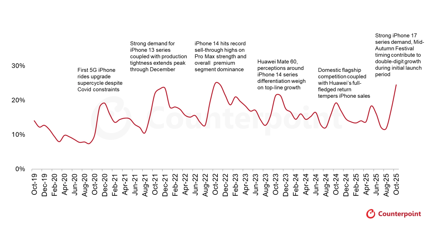 Para novembro, os analistas preveem um maior impulso da Apple. No entanto, o ambiente competitivo pode mudar com os planos da Huawei de lançar a série Mate 80 em 25 de novembro, algo que pode influenciar o segmento de alta qualidade.
