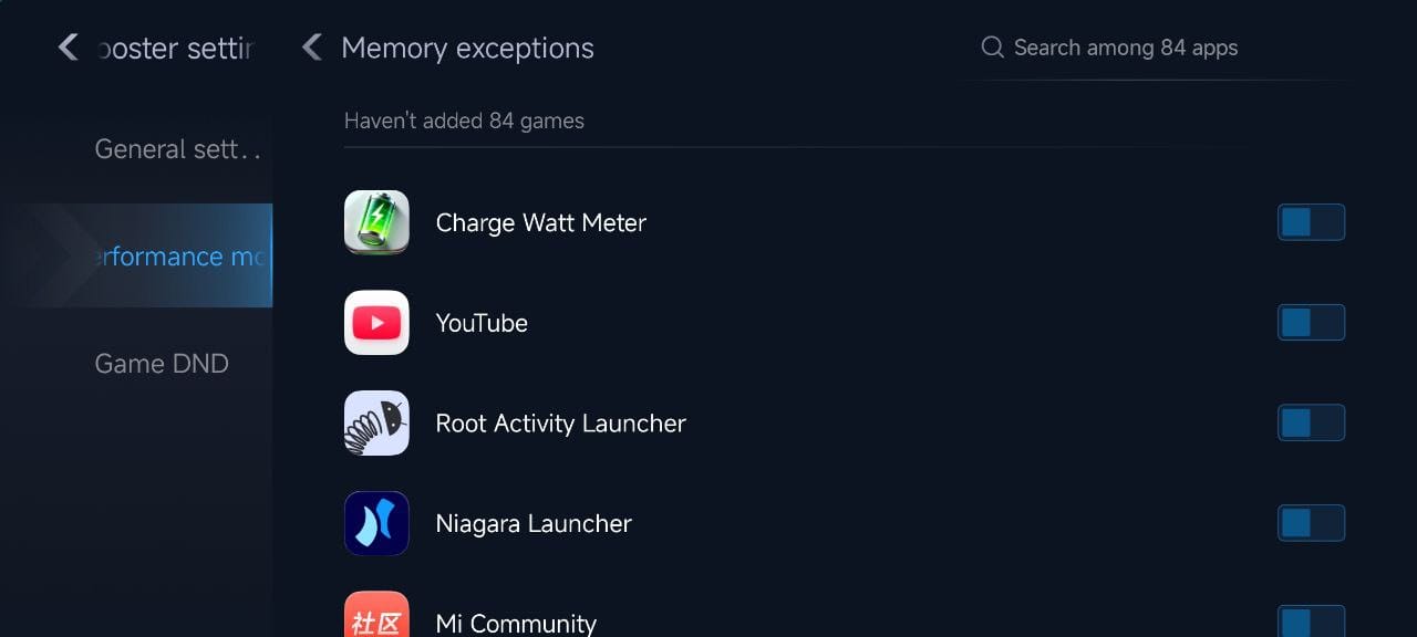 Para ativá-la, basta abrir Configurações do Game Turbo > Desempenho > Exceções de memória. Aqui, escolha os aplicativos que você deseja que o Game Turbo encerre à força sempre que você entrar em um jogo. Isso evita que aplicativos em segundo plano desnecessários usem a memória ou os ciclos da CPU para que seu telefone aumente o desempenho nos jogos.