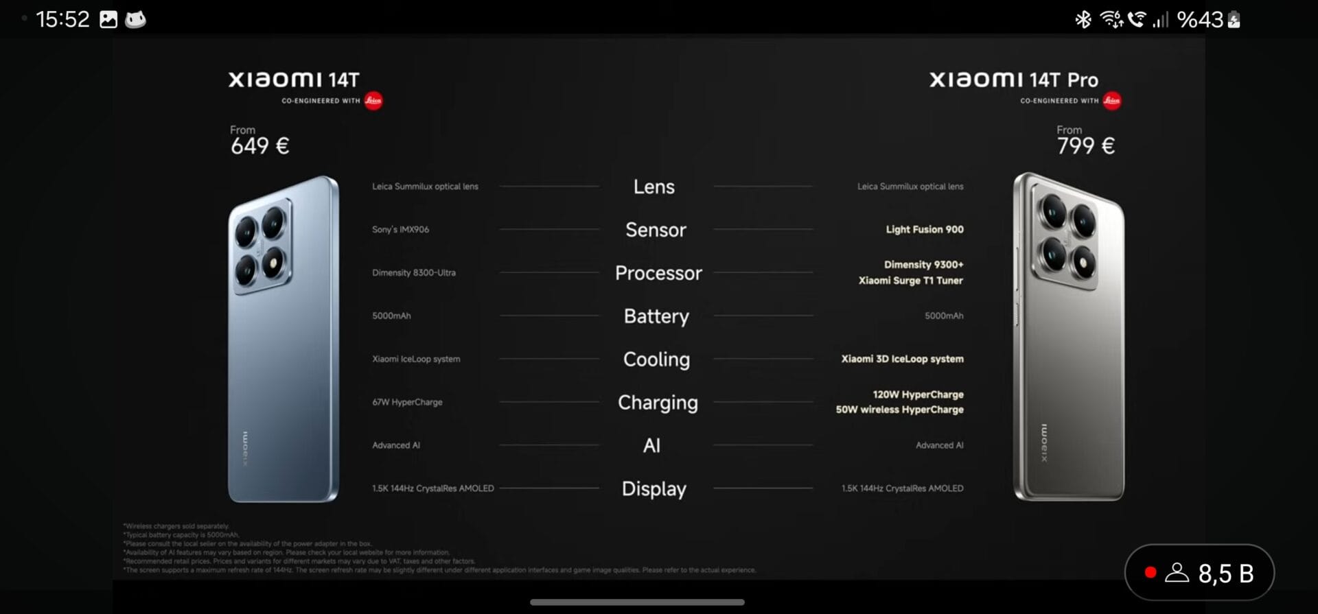 Öte yandan Xiaomi 14T‘nin, Pro versiyonunun aksine daha bütçe dostu olduğu söyleniyor, ancak yine de oldukça etkileyici özelliklere sahip.