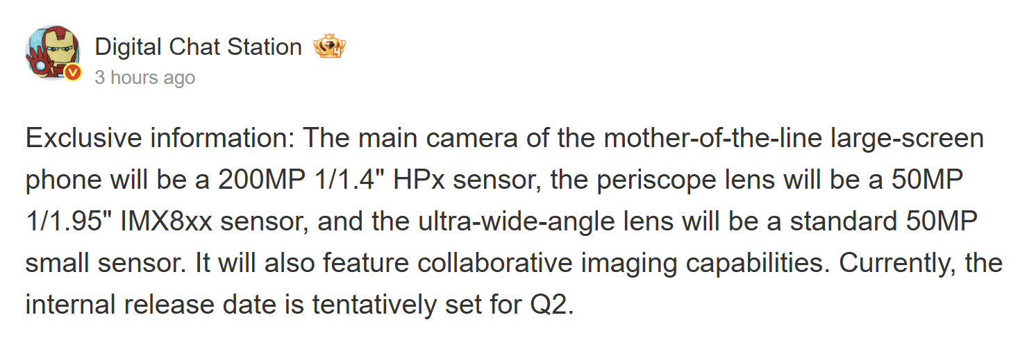 De acordo com o Digital Chat Station, um conhecido informante do Weibo, uma determinada empresa está trabalhando em um novo dispositivo principal com uma tela grande. Embora a publicação não tenha revelado o nome do dispositivo, a seção de comentários e outros rumores indicam que esse dispositivo provavelmente será o Xiaomi 17 Max. A câmera será o principal recurso desse dispositivo. De acordo com o vazamento, esse dispositivo terá um sensor de câmera de 200 MP com um sensor Samsung HPx de 1/1,4 polegada. Embora esse sensor seja semelhante aos apresentados em outros dispositivos Xiaomi, espera-se que seja um sensor de 200 MP.