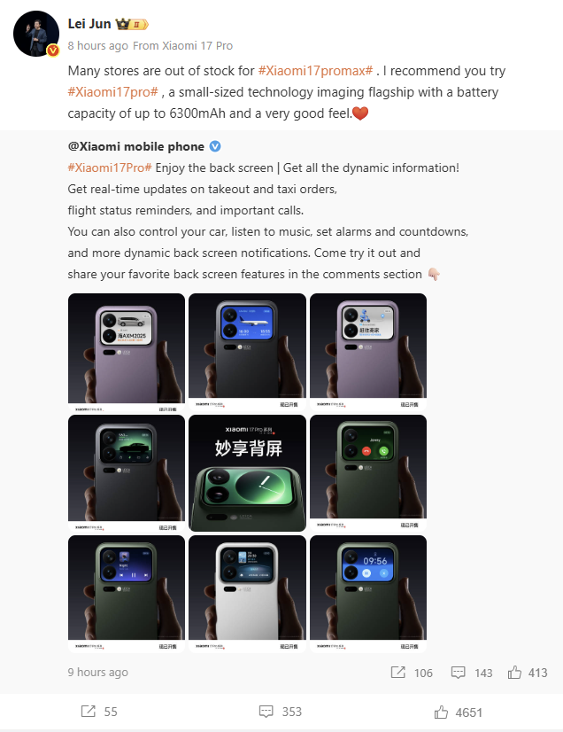 Em 28 de setembro, o fundador, presidente e CEO da Xiaomi, Lei Jun, compartilhou uma atualização no Weibo, confirmando que muitas lojas ficaram sem estoque do tão aguardado Xiaomi 17 Pro Max. Em sua postagem, ele incentivou entusiasticamente os fãs a conferir o Xiaomi 17 Pro como uma alternativa, afirmando que ele “parece muito bom”. Essa recomendação destaca o imenso sucesso de todo o lançamento da série Xiaomi 17. Para os usuários ansiosos por colocar as mãos na tecnologia mais recente da Xiaomi, o modelo Pro oferece uma experiência fantástica, mesmo que o Pro Max não esteja disponível no momento. O entusiasmo em torno de ambos os dispositivos prova mais uma vez que a Xiaomi é uma força dominante no mercado global de smartphones.