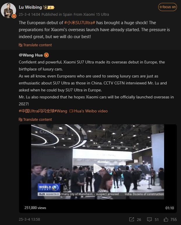 Xiaomi’s SU7 Ultra stole the limelight at MWC 2025 with its futuristic design and high-end technology. Lu Weibing, on Weibo, pointed out the significance of this feat, “The European debut of the Xiaomi SU7 Ultra has stirred up a huge shock! Preparations are already underway for the launch of Xiaomi overseas. The pressure is truly enormous, but we will do our best!”