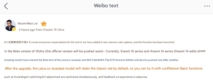 An exciting news for Mi camera hobbyists, @Xiaomi Miao Lei, Xiaomi’s Camera Department’s Deputy General Manager, unveiled some important details on the company’s camera software updates today. First showcased at the Xiaomi 15 Ultra and SU7 Ultra launch conference in February, the new simple camera interface has been a buzz among fans. In response to feedback on their favorite Leica red UI, now Xiaomi confirms that all Leica co-branded phones will keep their classic red interface by default after an update, in addition to offering six new color options to unlock even more personalization potential for users with varying tastes.