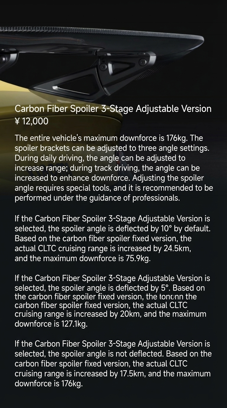 Efficiency Mode (10° Angle): Increases the CLTC cruising range by 24.5 km while providing 75.9 kg of downforce.
