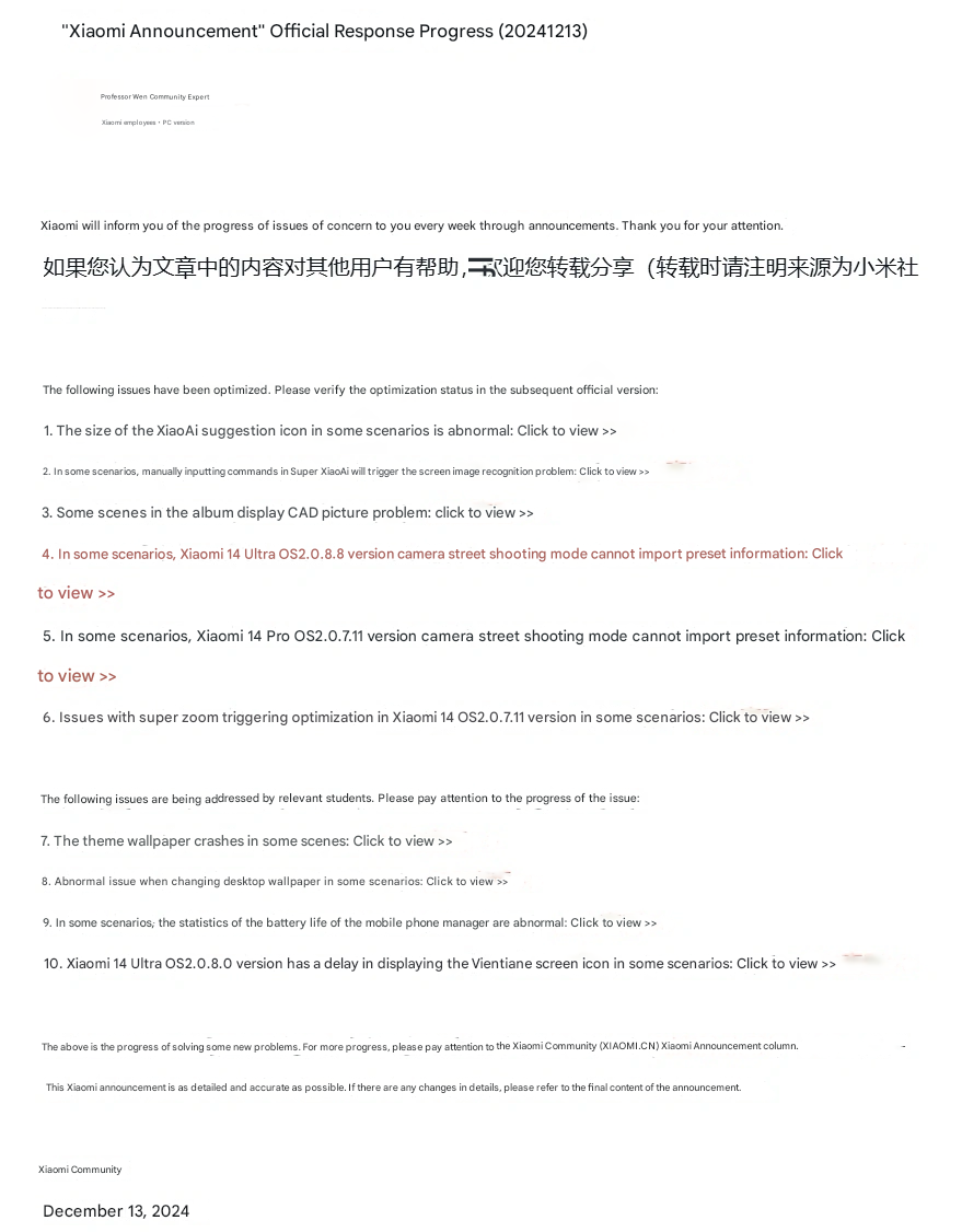 - Camera Street Mode Enhancements: Optimized the issue of importing preset information in Street Photography Mode for Xiaomi 14 Pro (OS 2.0.7.11) and Xiaomi 14 Ultra (OS 2.0.8.8).