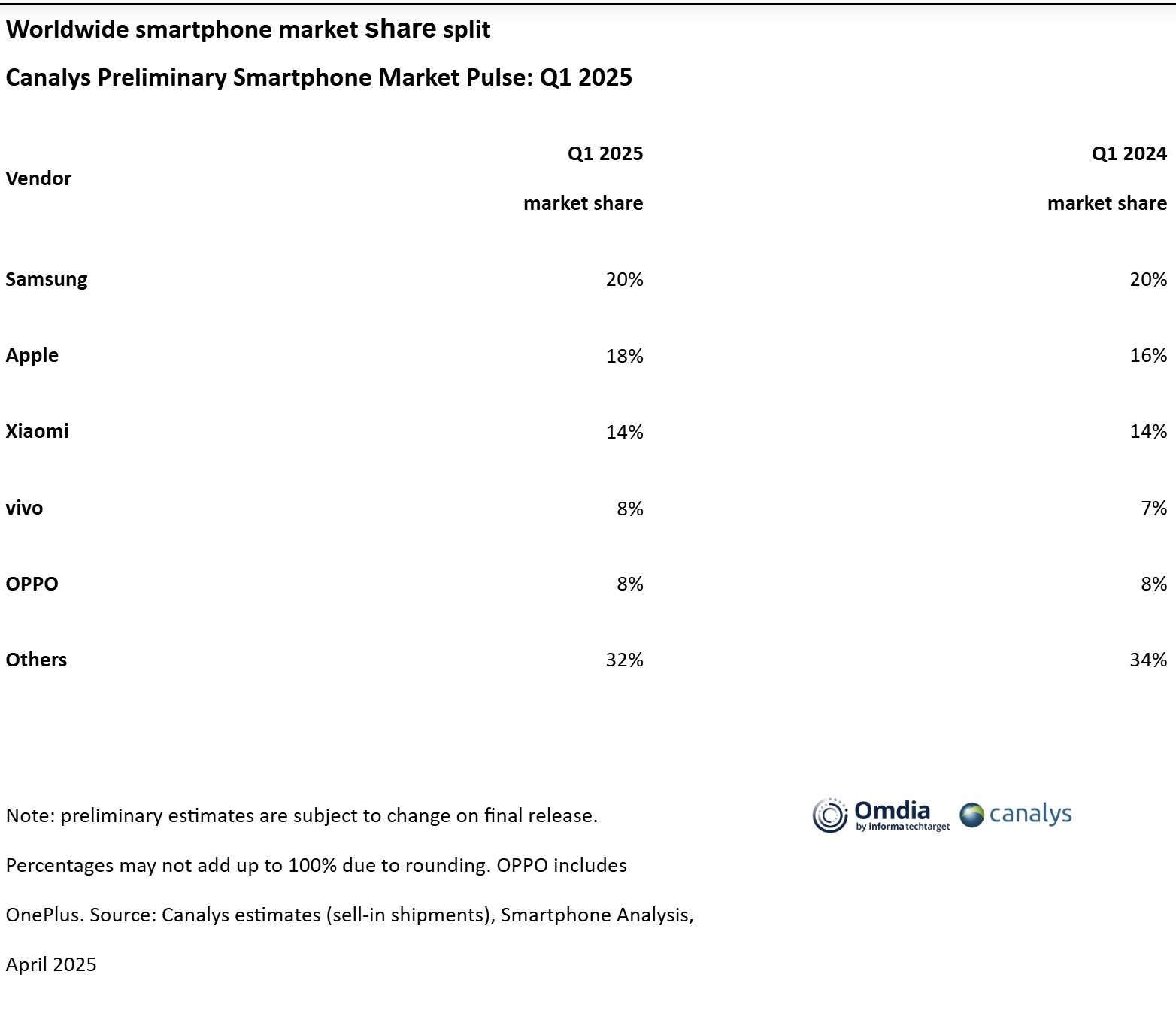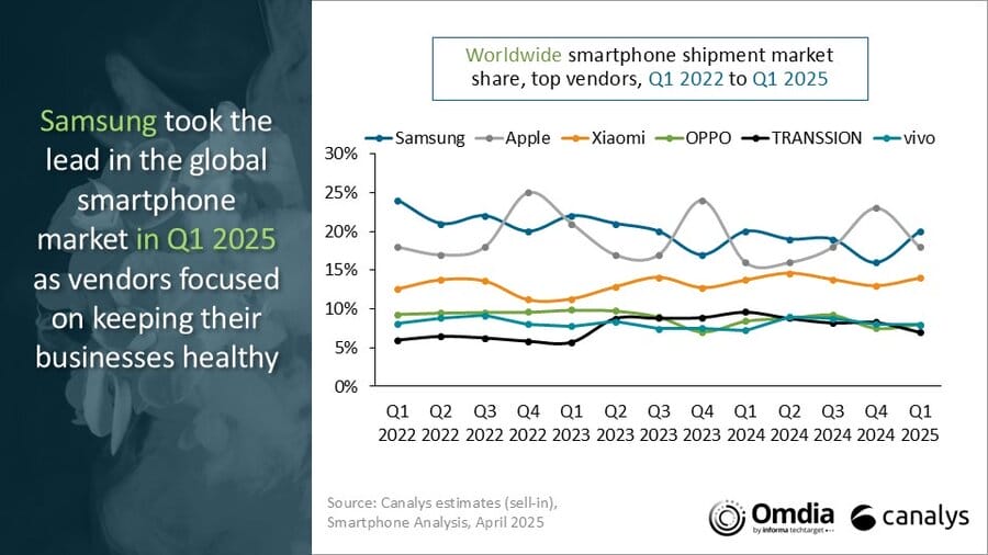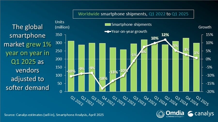 In einem neuen Bericht, der am 15. April 2025 von Canalys veröffentlicht wurde, verzeichnete der weltweite Smartphone-Markt im ersten Quartal trotz einiger Herausforderungen ein Wachstum von 1 % im Vergleich zum Vorjahr. Der makroökonomische Druck, das schwache Verbrauchervertrauen und die Verschiebung der Auslieferungen in den Vertriebskanälen beeinflussten den Markt, aber die führenden Hersteller konnten dennoch mit der Konkurrenz mithalten.
