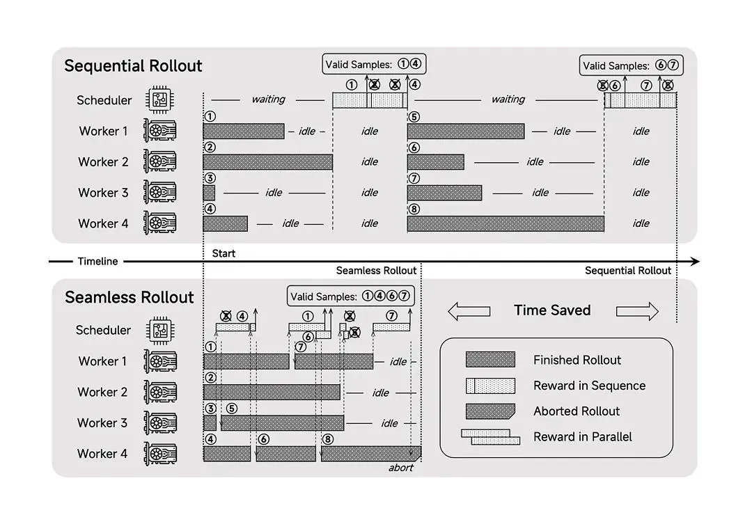 - Nahtloses Rollout-System: Ein effizienzorientiertes System, das das RL-Training um das 2,29-fache und die Verifikation um das 1,96-fache beschleunigt hat