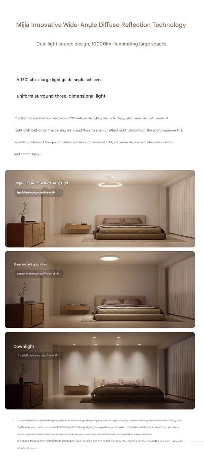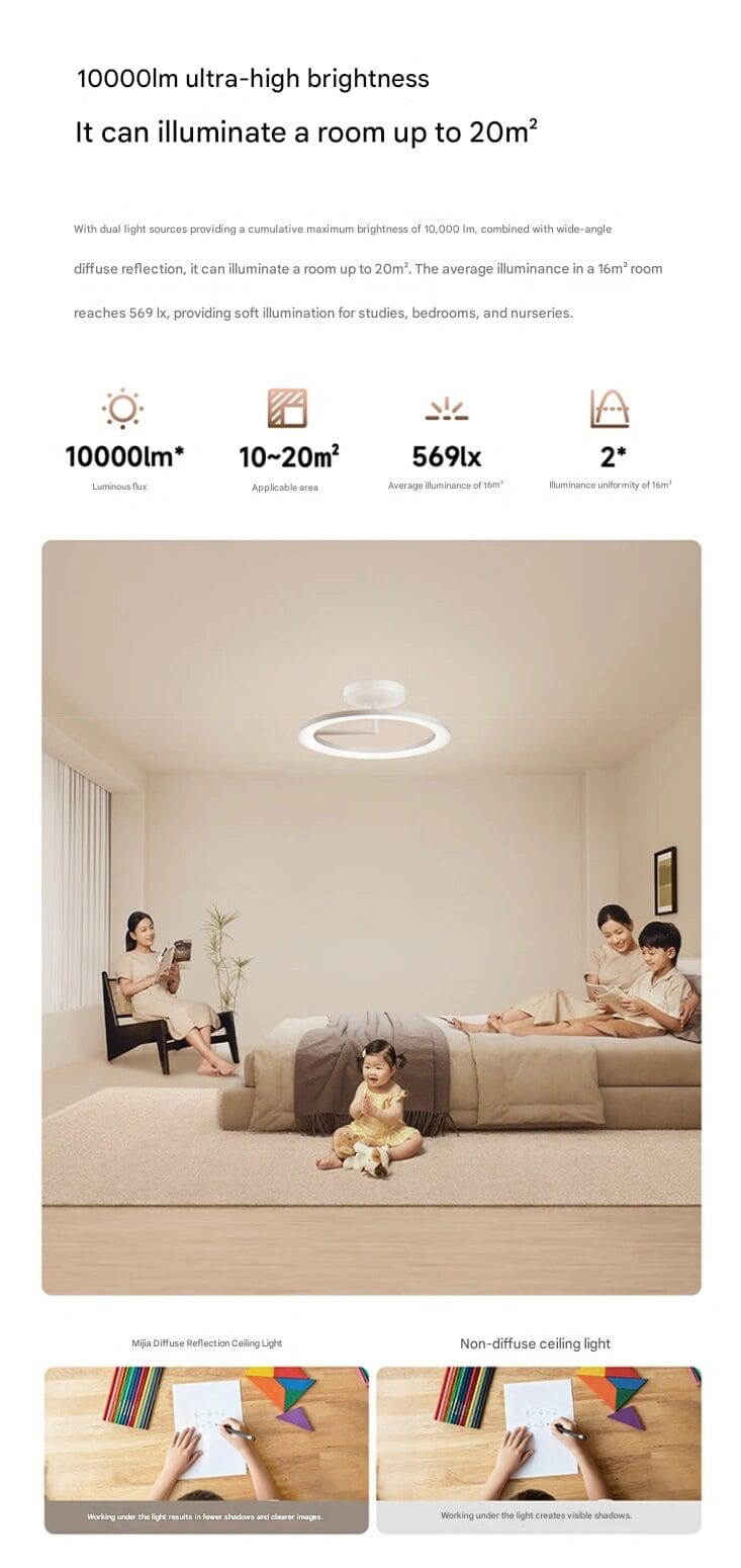 Die Mijia Diffuse Reflection Ceiling Light erreicht eine Spitzenleistung von 10.000 Lumen, was eine effiziente Beleuchtung von Räumen mit einer Größe von bis zu 20 m² ermöglicht. In von Xiaomi durchgeführten Tests erreichte ein 16 m² großer Raum eine durchschnittliche Beleuchtungsstärke von 569 lx, was das Produkt zu einer idealen Lösung für Schlafzimmer, Arbeitszimmer, Kinderzimmer und kompakte Wohnungen macht. Seine Höhe von 20 cm trägt dazu bei, dass der Raum optisch größer und geräumiger wirkt.