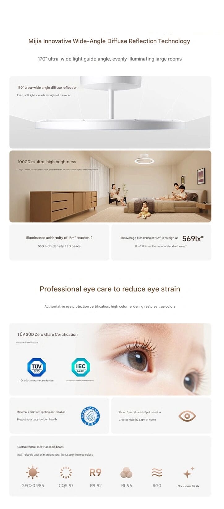 Für eine sichere und komfortable Beleuchtung ist die Deckenleuchte vom TÜV SÜD als blendfrei zertifiziert und erfüllt die Anforderungen an eine “Mutter-und-Baby-Beleuchtung”. Der Farbwiedergabeindex Ra97 sorgt für eine natürliche Farbwiedergabe. Die Qingshan-Lösung für visuellen Komfort reduziert Flimmern. Xiaomi unterstreicht, dass sogar Kleinkinder das Licht ohne Beschwerden betrachten können, was die Eignung für sensible visuelle Umgebungen unterstreicht.