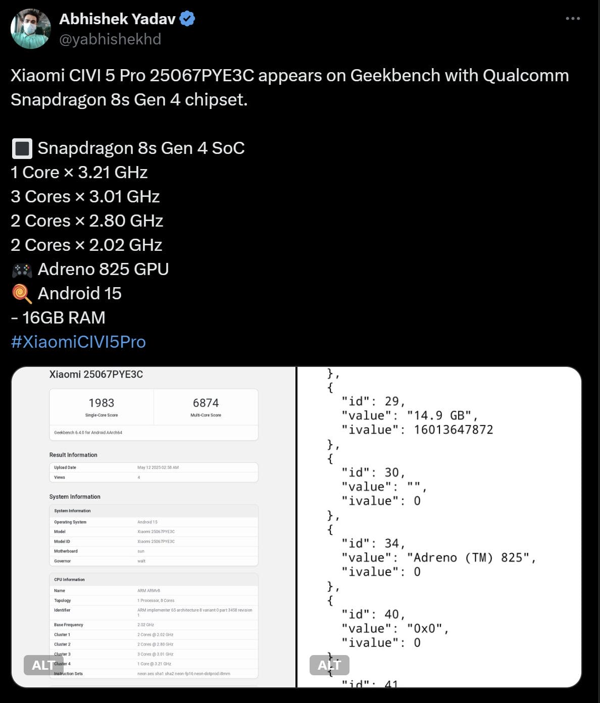 A listagem do Geekbench confirma o fato de que o Civi 5 Pro tem um chipset Snapdragon 8s Gen 4 de última geração. A seguir, você encontra as principais especificações de configuração: