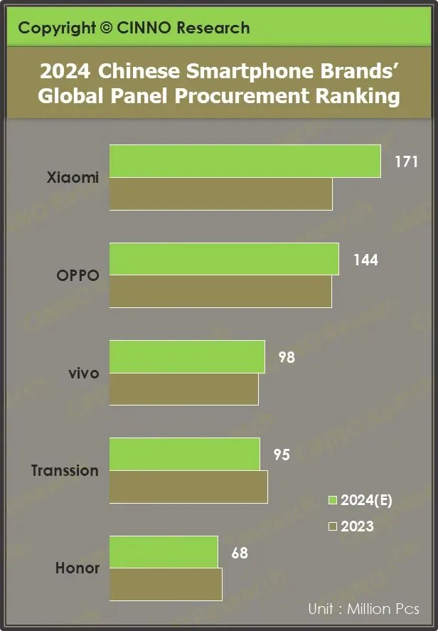 Essa é a maior mudança no setor: A Xiaomi está no topo da lista dos principais fabricantes de smartphones da China em termos de aquisição de painéis para 2024. De acordo com o último relatório da CINNO Research, ela adquirirá 171 milhões de unidades de painéis este ano, um aumento de 21,7% em relação ao ano anterior.