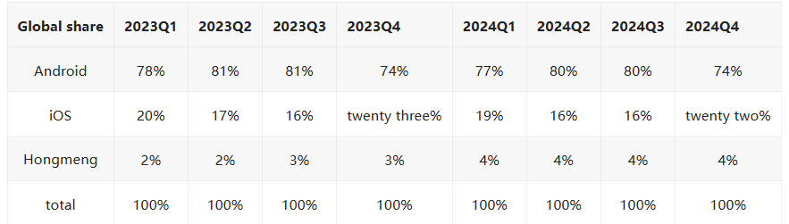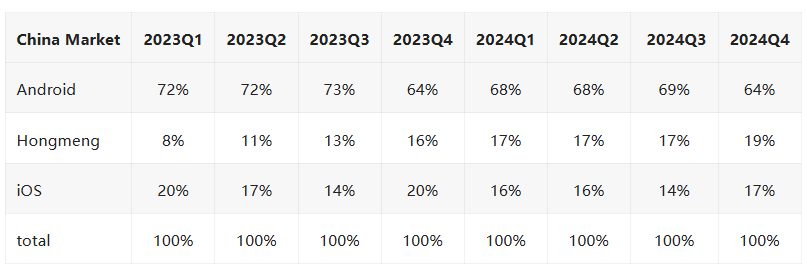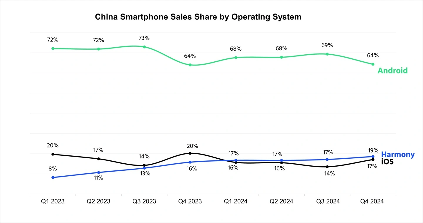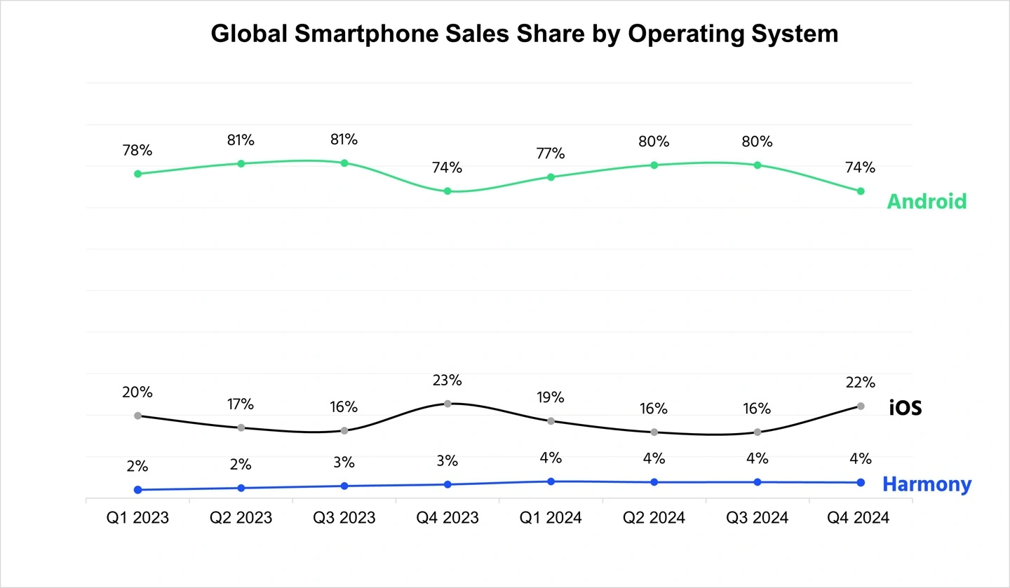 - iOS üst üste dördüncü çeyrekte de HarmonyOS’un gerisinde kalarak %17’ye düştü