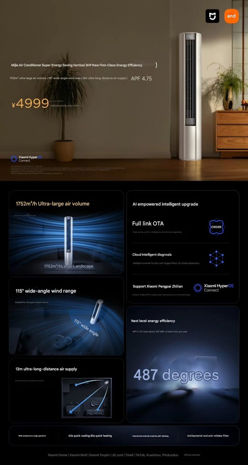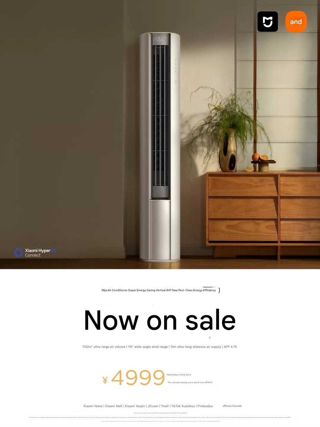 Xiaomi hat endlich die Mijia Super Energy Saving Vertical 3HP Air Conditioner vorgestellt und sorgt schon jetzt mit ihren High-End-Spezifikationen und intelligenten Funktionen für Aufsehen. Das Klimagerät wird heute Abend um 20 Uhr (chinesische Zeit) zu einem Startpreis von 4 .999 Yen (rund 690 US-Dollar) erhältlich sein. Mit Hilfe von Subventionen der chinesischen Regierung können qualifizierte Käufer das Gerät für 3 .999,2 ¥ (rund 552 $) erwerben. Dieses vertikale Turmklimagerät bietet im Vergleich zur letzten Generation eine verbesserte Leistung mit mehr Luftvolumen, einem größeren Leistungsbereich und einer verbesserten Energieeffizienz.