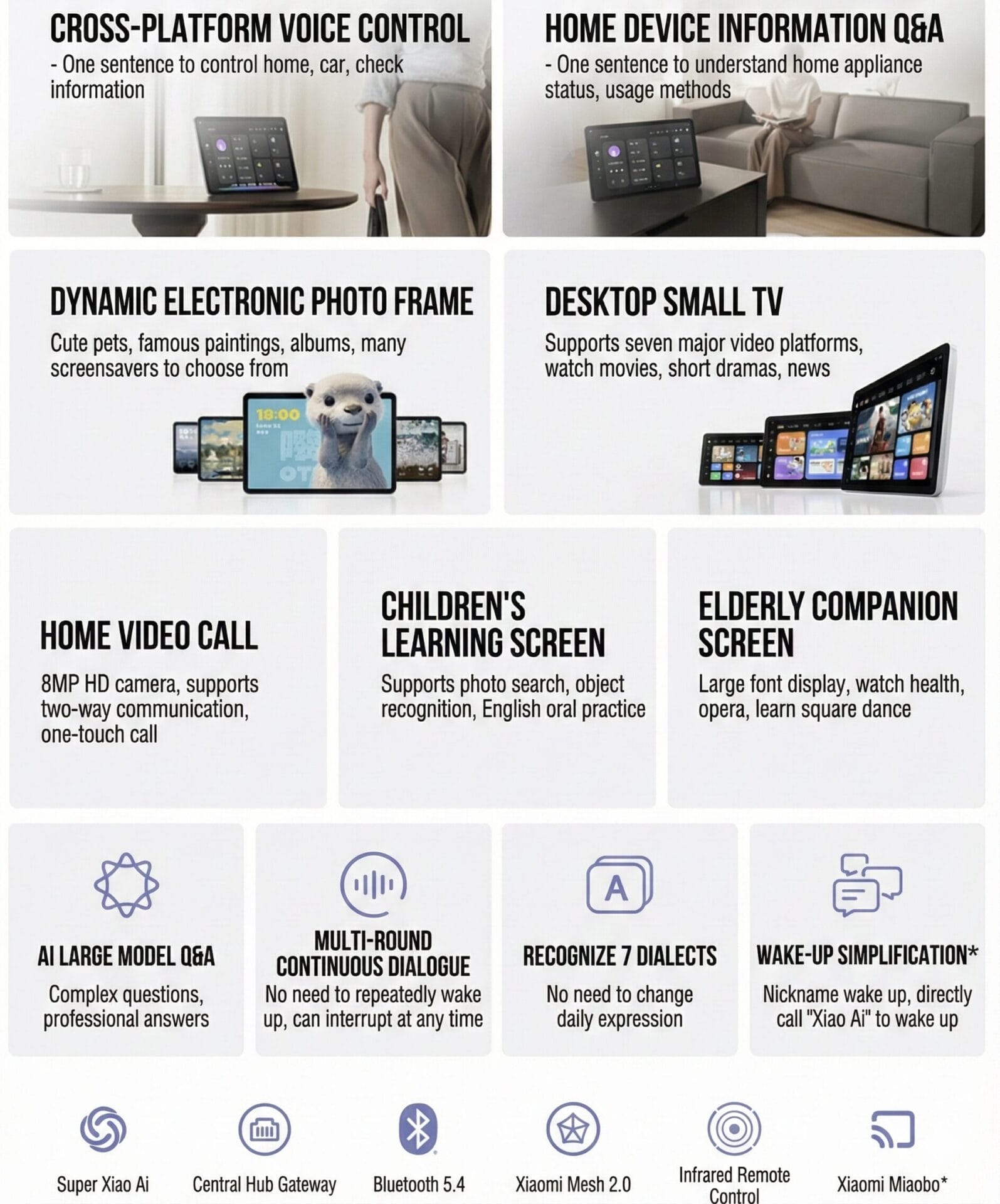 Uma câmera frontal de 8 MP permite chamadas de vídeo bidirecionais por meio de aplicativos compatíveis, como o WeChat, para ajudar a família a se manter atualizada. A interação por voz é feita pelo XiaoAI, o assistente de IA da Xiaomi. Deve-se mencionar, no entanto, que as funções do XiaoAI estão disponíveis apenas na China, pois o serviço de bloqueio de região não é compatível com os mercados globais atualmente.