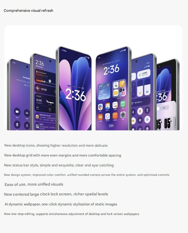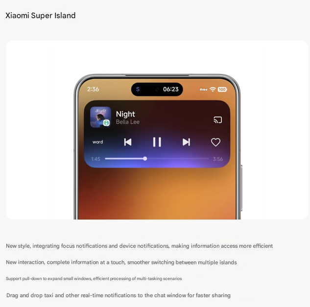 O HyperOS 3 oferece um conjunto de melhorias projetadas para elevar a experiência do usuário e o desempenho do dispositivo. Entre as mudanças notáveis estão elementos de interface refinados, ícones renovados e indicadores atualizados de bateria e sinal. O sistema também apresenta a funcionalidade de ilha dinâmica e recursos aprimorados de chamadas e mensagens, com base em sugestões de design conhecidas dos principais concorrentes do setor.