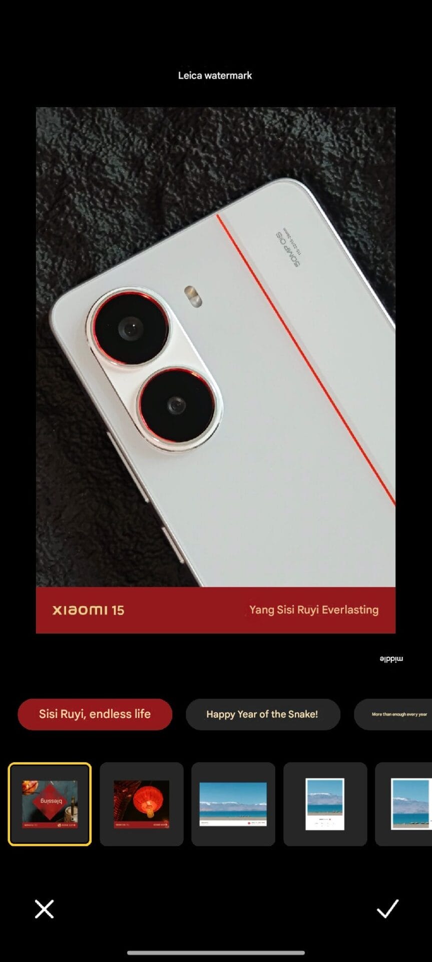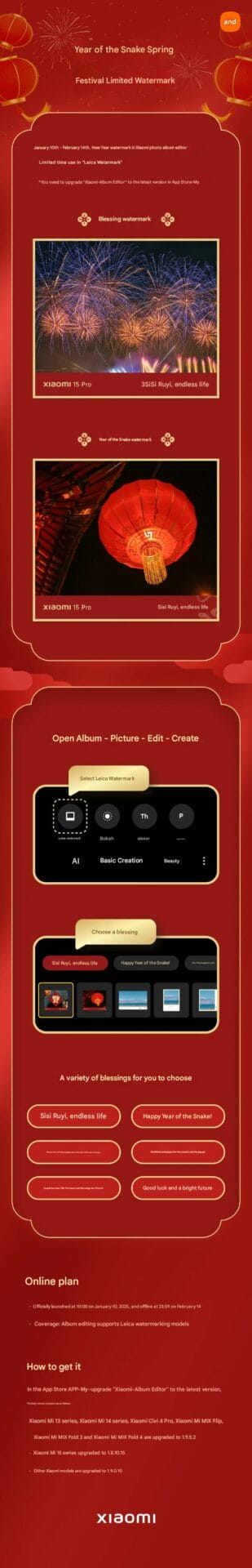 Xiaomi, albüm düzenlemedeki Leica filigran özelliği aracılığıyla kullanıcılara bayram tebrikleri getiren “Yılan Yılı Bahar Festivali Filigranı “nın lansmanını duyurdu. Bu özellik 10 Ocak – 14 Şubat 2025 tarihleri arasında sınırlı bir süre için geçerli olacak.