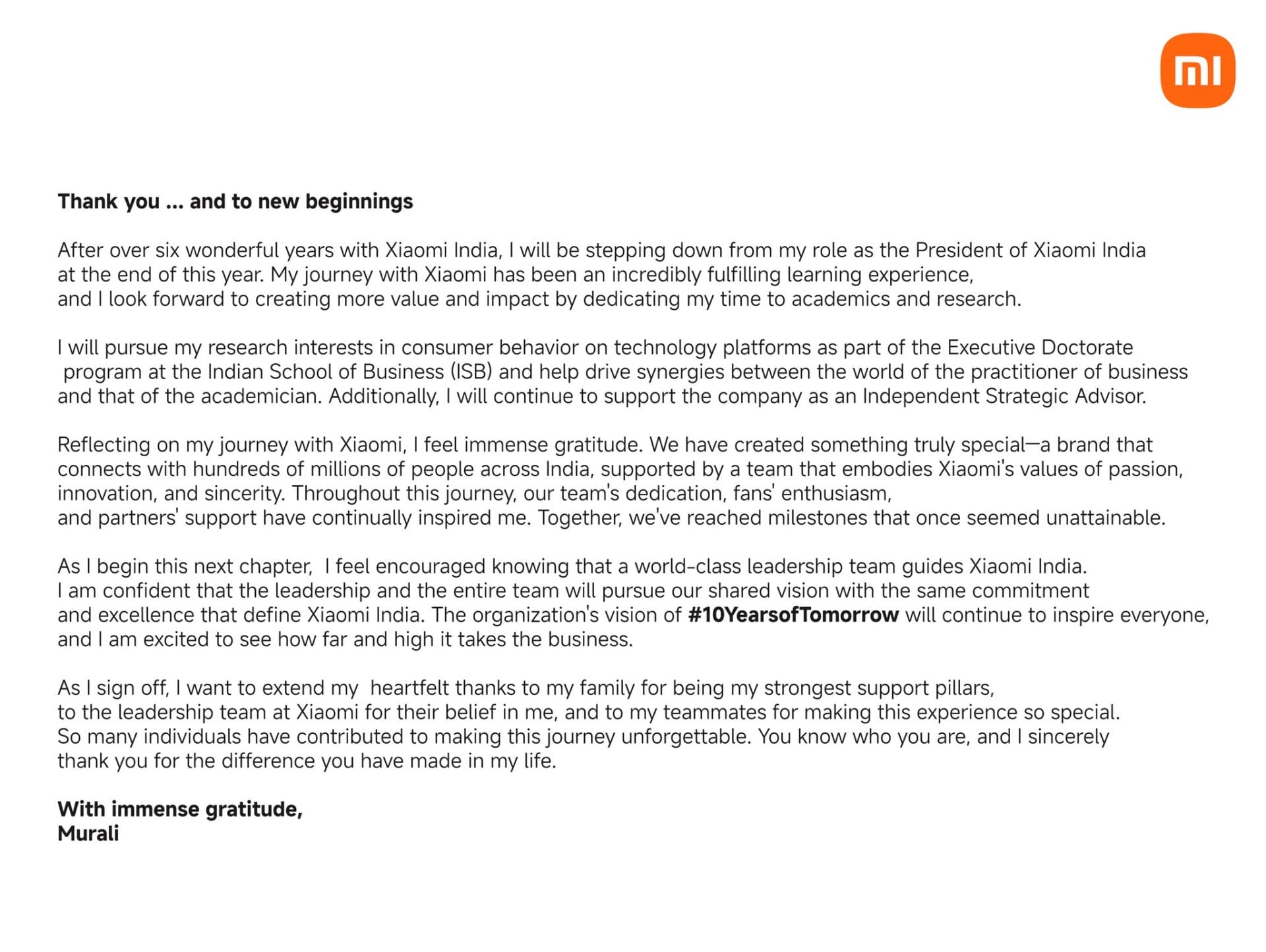 As Xiaomi India embarks on a new chapter, Muralikrishnan’s heritage on resilience, strategic expansion, and strong leadership will no doubt form a base for further growth. Innovation from the leadership team in terms of community engagement and local manufacturingFurther consolidates the brand’s long-lasting influence on the Indian market, a testament to Xiaomi’s vision, “10 Years of Tomorrow.”.