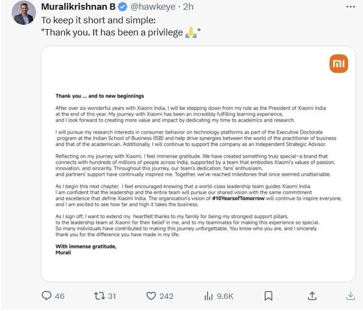 Reflecting on his journey, Muralikrishnan thanked his experiences at Xiaomi India, referring to the firm as “one of the most fulfilling chapters” of his career. Again, he referred to the core values of Xiaomi-sincerity, passionate love, and innovation-which he said have played a very important role in the brand’s connection with millions of users across India.