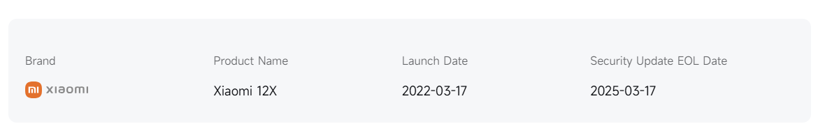 O Xiaomi 12X, que foi promovido como uma variante compacta do carro-chefe, também se tornou parte dos telefones que não receberão mais nenhum suporte adicional em termos de atualizações de segurança. Como a série Redmi Note 11 mencionada anteriormente, o 12X conclui seu ciclo de atualização com o HyperOS 1 baseado no Android 13. O Xiaomi 12 Lite não receberá a atualização do HyperOS 2, apesar de já estar pronto para receber uma atualização.