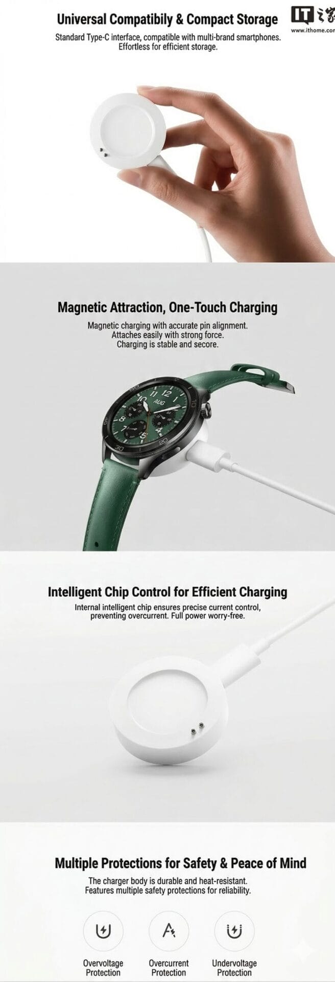 Comprehensive Safety Protections: To ensure long-term battery health, the dock includes overvoltage, overcurrent, and undervoltage protection. These safeguards protect the wearable from electrical fluctuations in various environments.